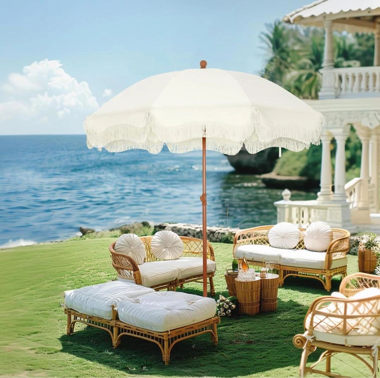 White Boho Umbrella - Perfect for cooling off the bar or keeping your guest cool. Includes a heavy teakwood base or Sand Anchor.